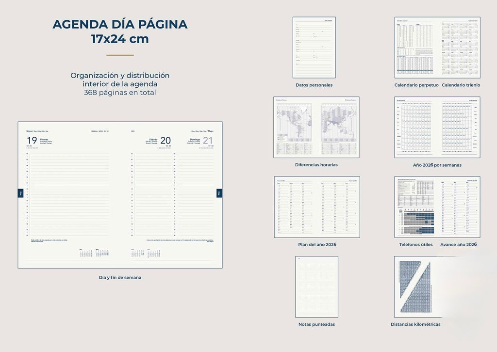 - Agenda día por página (seis páginas por semana).